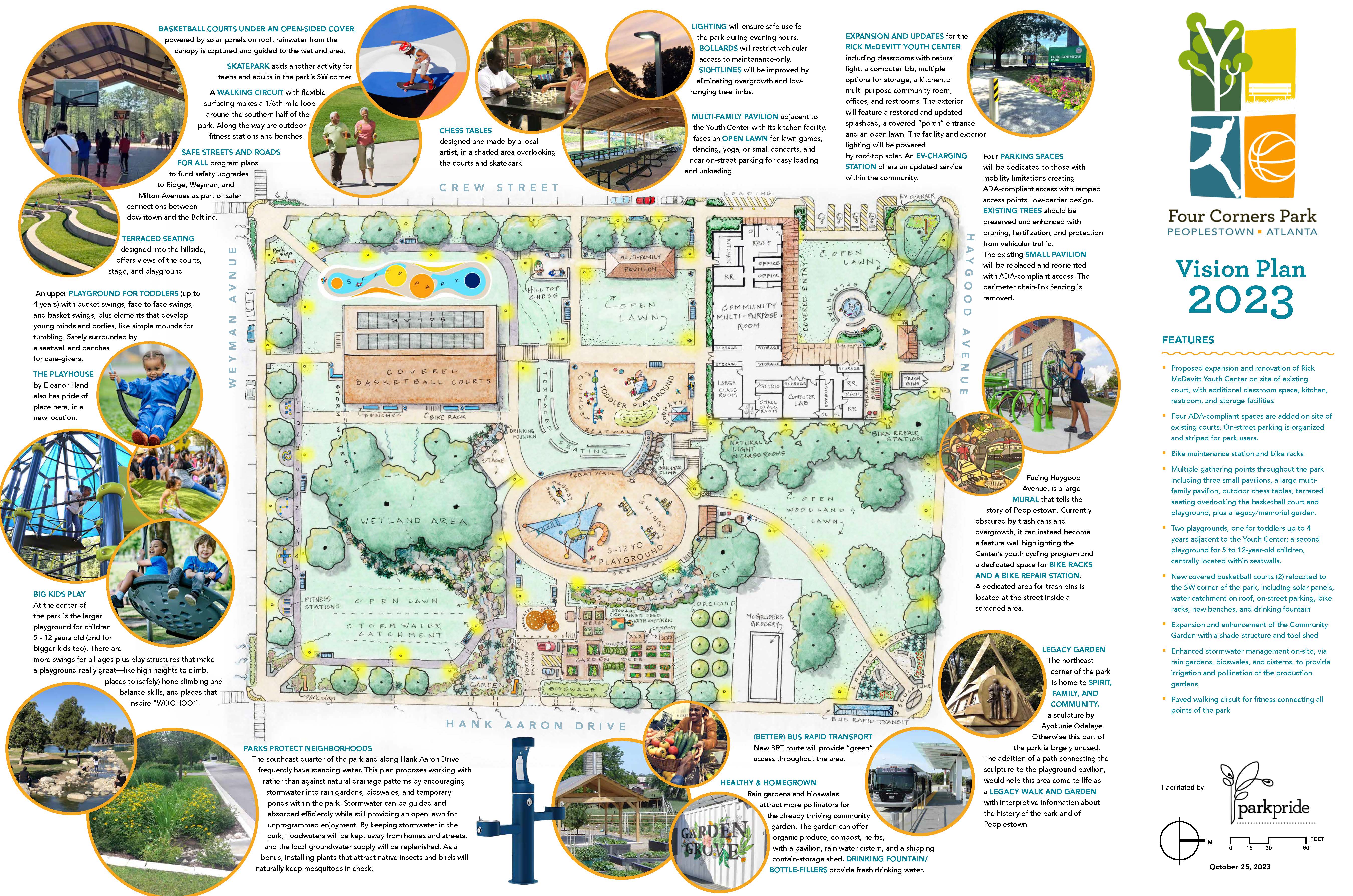 Four Corners Park is a nearly five-acre site in the heart of Peoplestown. It is currently home to the Rick McDevitt Youth Center, a playground, pavilion, two basketball courts, grassy fields and a community garden. In collaboration with the Park Pride Visioning team, Friends of Four Corners Park, and Peoplestown community members, Peoplestown Revitalization Corporation (PRC) completed a comprehensive park plan for Four Corners Park in March 2024.